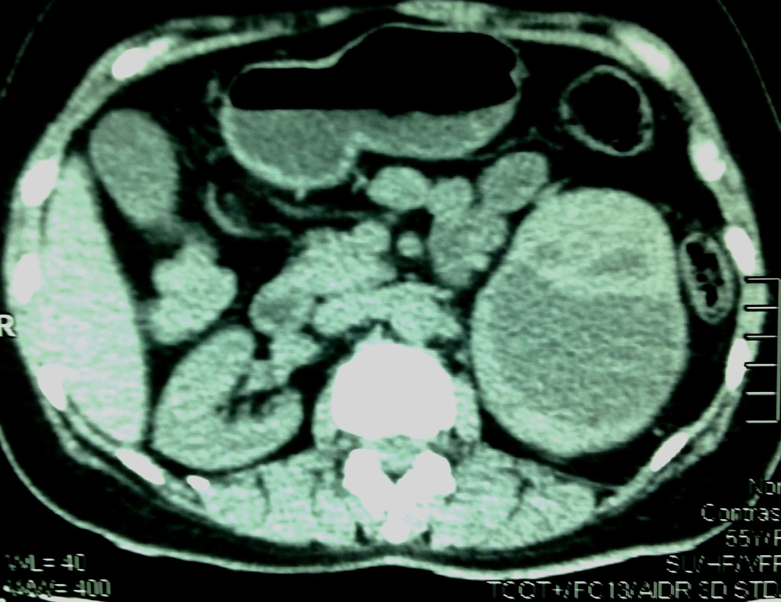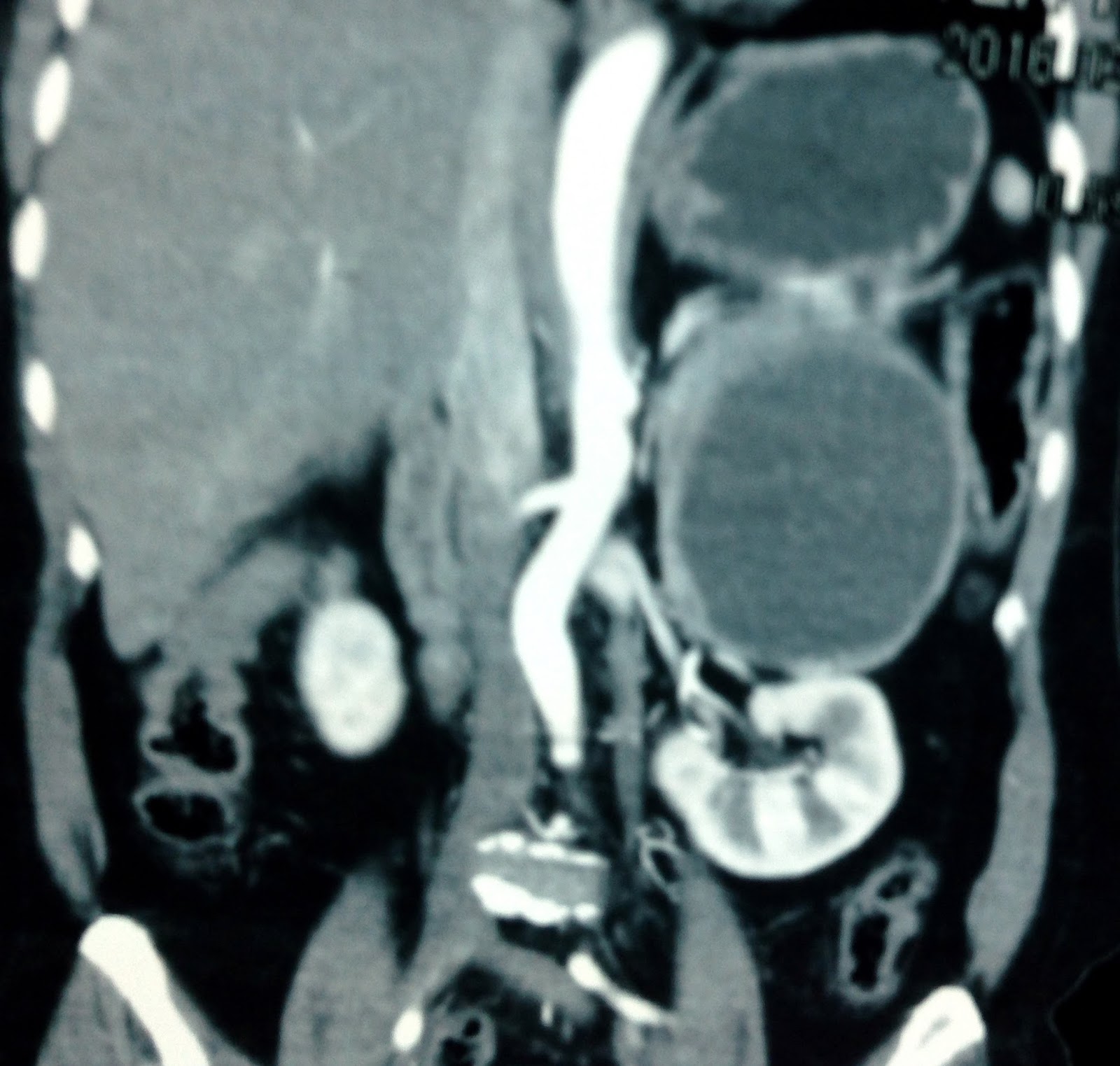 MSCT with CE= CT1: sagittal plan this mass at adrenal fossa deplaced left kidney. CT2: normal vascular supply to kidney . CT3: crossed section of.this mass inhomogeneous in contrast enhancement.