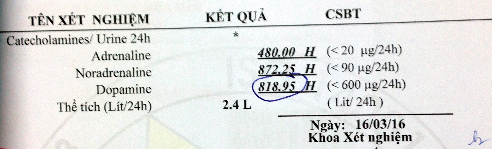 Blood test shows very high catecolamine of 24 hours in urine and metanephrine in plasma is 1521.53/mL (normal <90 ng/mL).